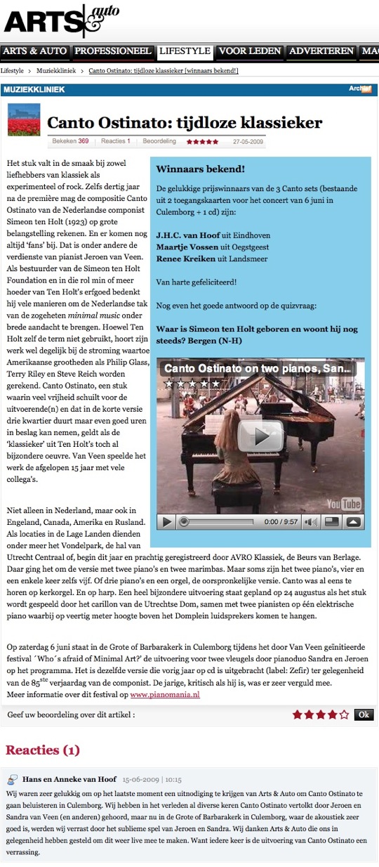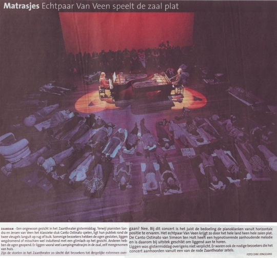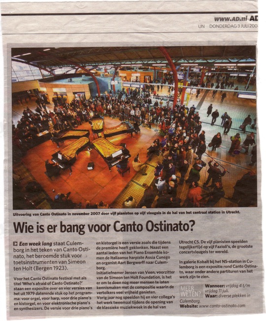 De Volkskrant: ‘Canto Ostinato geldt als een ‘magische ervaring, die liggend kan worden genoten. Een ritueel haast. Een werk in uitvoering ook; niets ligt precies vast. De uitvoerders leiden elkaar, met continue oog- en oorcontact, door het werk heen. Minimal music met een maximale uitwerking.’