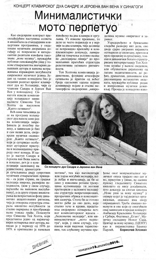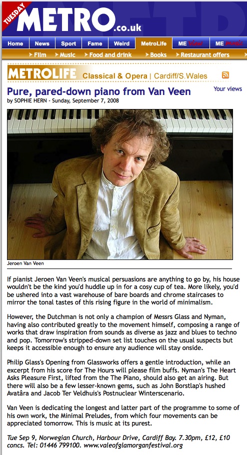 Dutch pianist and composer, Jeroen van Veen, the leading exponent of minimalism in Holland today, Alan Swanson (Fanfare, 2010)